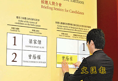 抽籤結果,1號候選人為公民黨梁家傑,2號候選人為行政長官曾蔭權。選管會主席彭鍵基表示,候選人的首輪投票將於本月25日舉行,投票會直至其中一名候選人取得過半選委支持才會結束,否則就會再舉行2、3輪投票。