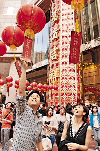 ■銅鑼灣時代廣場迎元宵節,昨掛上多個燈籠及燈謎,讓情侶們猜猜。 本報記者李志樑 攝
