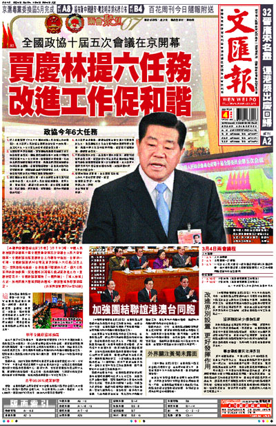 【本報兩會報道組北京3日電】3日下午3時,中國人民政治協商會議第十屆全國委員會第五次會議在人民大會堂開幕。全國政協主席賈慶林在工作報告中指出,在新的一年裡,全國政協將抓好合理設置界別等六大任務,要採取積極措施,在改進履行職能的方式、擴大公民有序的政治參與、促進團結和諧等方面認真改進工作。賈慶林還表示,全國政協將堅持「一國兩制」、「港人治港」方針,加強同廣大香港同胞的團結,確保香港長期繁榮穩定。(尚有兩會新聞刊A4至A8版)