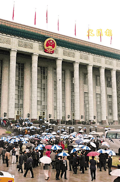 ■3日15時,中國人民政治協商會議第十屆全國委員會第五次會議在北京人民大會堂開幕。與會者與記者們的雨傘組合成一幅有趣的圖片。 新華社