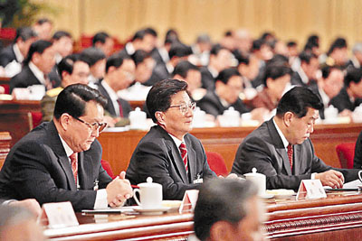 ■李長春、黃菊、賈慶林(左起)在主席台就座。 新華社