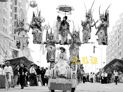 5日,民間藝人在吳川市舉行的民間藝術大巡遊中表演飄色《六國封相》。當日,作為2007廣東吳川元宵民間藝術節暨經貿洽談會的重頭戲,吳川民間藝術大巡遊活動隆重舉行。精彩的民間藝術表演魅力四射,吸引數萬市民和遊客駐足觀看。 新華社