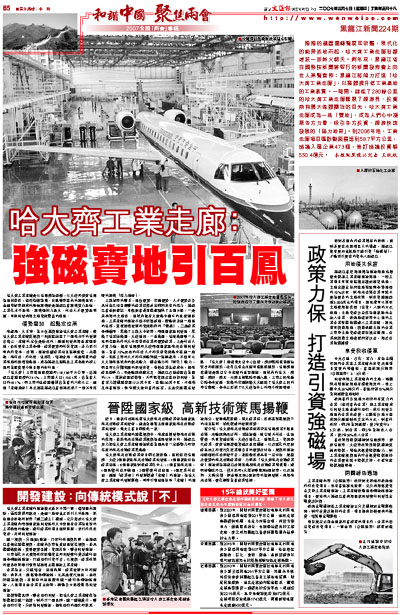 隆隆的機器運轉聲震耳欲聾,現代化的廠房拔地而起,哈大齊工業走廊沿線建設一派熱火朝天。兩年前,黑龍江省在國務院新聞辦舉行的新聞發佈會上向世人高聲宣佈:黑龍江將傾力打造「哈大齊工業走廊」,以整體提升老工業基地的工業素質。一時間,綿延了280餘公里的哈大齊工業走廊匯聚了經濟界、投資商和廣大媒體關注的目光,哈大齊工業走廊成為一塊「寶地」,成為人們心中凝聚各方力量、吸引各方投資、經濟快速發展的「磁力地帶」。到2006年底,工業走廊項目區啟動面積達到58.7平方公里,協議入區企業473個,簽訂協議投資額550.4億元。