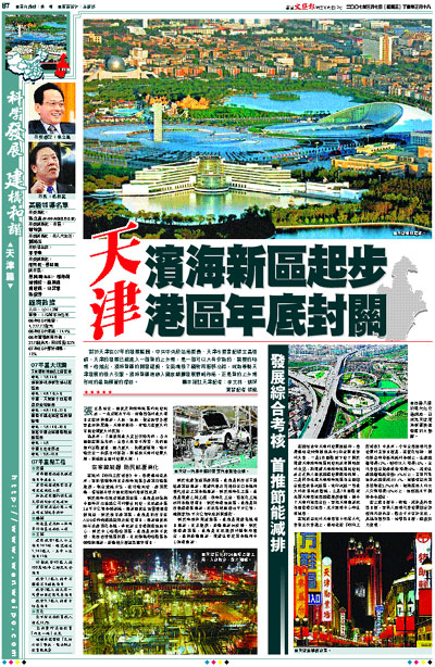 在總結去年天津的發展經驗時,市長戴相龍特別提到其中3件至關重要的大事:一是5月國務院下發了關於推進天津濱海新區開發開放有關問題的意見,將推進天津濱海新區開發開放正式納入國家總體發展戰略佈局;二是同時批准天津濱海新區為全國綜合配套改革試驗區,先行試驗一些重大的改革開放措施;三是7月國務院批覆天津市城市總體規劃修編,提升了天津的城市定位,要把天津建設成為國際港口城市,北方經濟中心和生態城市。