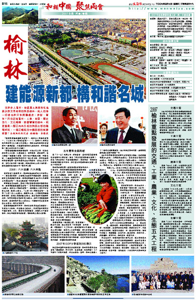 在「十一五」開局之年,陝西省委、省政府從全省經濟社會發展的大局出發,提出「陝北要實現跨越式發展」。作為「陝北板塊」的重要組成部分,榆林市委、市政府按照構建和諧社會的要求,對今後五年推進跨越式發展,作出了科學安排。