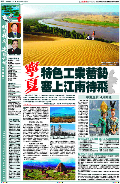 ■招商引資冀240億:寧夏在2006年舉辦了寧夏(香港)經貿文化旅遊活動周等系列招商引資活動,取得了豐碩成果,今年寧夏將繼續深入開展「招商引資年」活動,實施「產業對接、拓展市場、對外宣傳」三大戰略措施,全年力爭完成招商引資到位資金240億元。