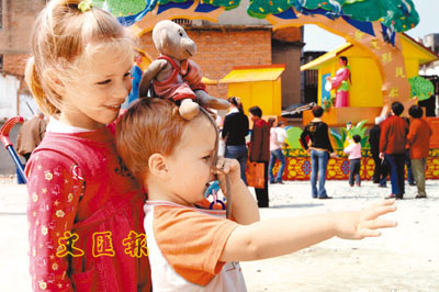 ■兩位隨父母來福州旅遊的小老外,在觀賞此間舉辦的福州南後街燈會時興奮地模仿花燈人物造型。福州南後街燈會自開展之日起,即盛況空前。本報特約通訊員言申攝
