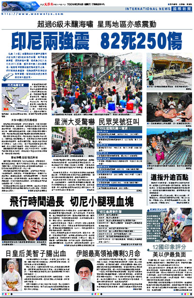 位處「火環」地震帶的印尼蘇門答臘昨天發生兩次逾6級的強烈地震,夷平數百間房屋,通訊網絡中斷,造成最少82人死亡及257人受傷,暫未有中國人的死傷報告。飽歷海嘯蹂躪的居民頓成驚弓之鳥,慌忙躲到高處暫避,但氣象部門沒有發出海嘯警報。鄰近的新加坡及馬來西亞有大廈搖晃。
