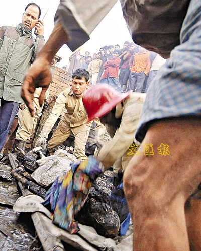 孟加拉首都達卡東南面135公里的城市吉大港,星期二發生貧民區大火,大火焚毀了超過100間房屋,最少有21人死亡。圖為消防員在現場移走燒焦的屍體。美聯社