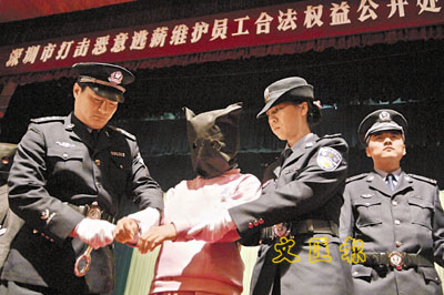 ■去年始,廣東採用強硬措施打擊拖欠工人薪金的行為。圖為深圳司法機關對欠薪逃匿的用人單位法人刑事拘留。資料圖片