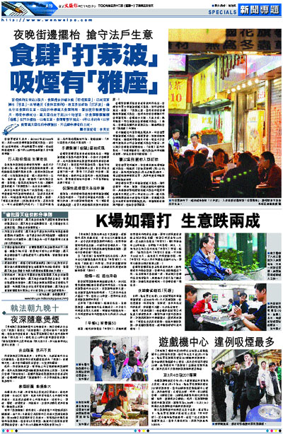 全民室內禁煙給食肆帶來衝擊。由於不少食肆以為,露天範圍不受禁煙條例規限,故此紛紛在店舖外擺放桌椅,更附加煙灰缸或小碟,以招攬煙民食客。踏入夜深時分,旺角、油麻地、佐敦、銅鑼灣一帶的部分食肆、茶餐廳,索性將檯搬往行人路,將舖外變身成露天「吸煙雅座」,生意出奇地興旺。