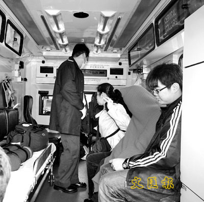 ■鬧自殺女學生紅布裹身,由母親及男友陪同送院。本報記者蔣焯文 攝