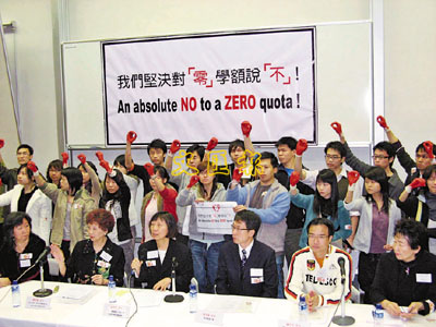 【本報訊】(記者 歐陽杏櫻)香港教育學院於08/09年度中學教育學士課程的體育、音樂及視覺藝術科,或不獲教統局分配學額,該校「零」學額關注組昨日發起抗爭大會。關注組召集人、教院體藝學系副教授區潔愛表示,已就削學額問題與教統局進行多次會議,但對方無正面回應有關「零」學額建議的理據,她質疑削學額將令體藝教育出現斷層,甚至使就讀該校體藝學科兩年制、約70名副學士一年級生,於畢業後頓失銜接機會。