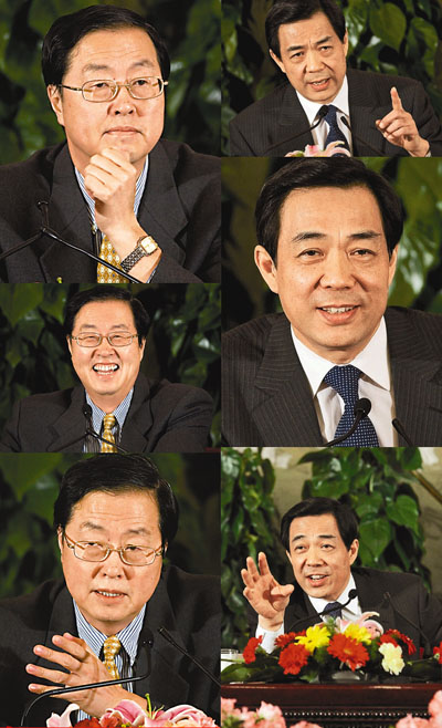 ■兩位「明星級」高官,中國人民銀行行長周小川(左)及商務部部長薄熙來(右)接受記者提問,全場表情多多,回答精彩紛呈,記者滿載而歸。