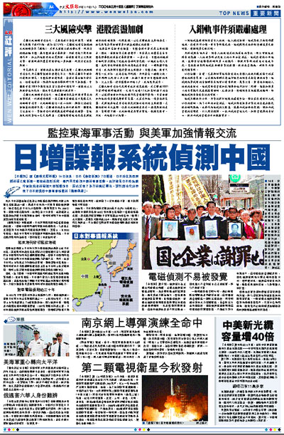 【本報訊】據《國際先驅導報》14日消息:日本《產經新聞》7日報道,日本將在其西南部的福江島新建一套電磁偵測系統,專門用來監視中國的軍事活動。由於這是日本防衛廳升省後批准的首個大型諜報項目,因此受到了各方的廣泛關注。該計劃也突出表現了日本對獲取中國軍事情報的「濃厚興趣」。