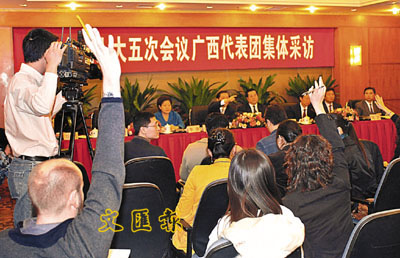 ■3月14日,十屆全國人大五次會議廣西代表團部分代表接受集體採訪。新華社