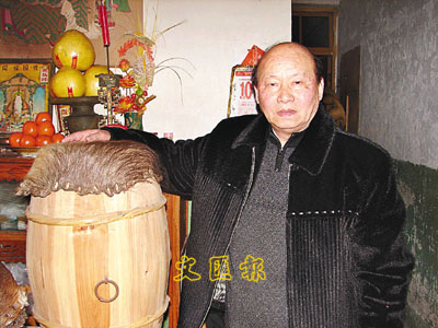 許老拿出一個狼串鼓,鼓的形狀很特別,鼓面是用綿羊皮製的,鼓底用牛皮,上下鼓都是用梧桐木,外面上漆,中間還有一小段竹子連接住上鼓和下鼓。鼓的外邊繩上還繫著類似鈕扣的小玩意,兩邊共16個,許老告訴記者,那是用來調音的,位置不同,鼓發出的聲音也不一樣。這樣一個鼓製好需要花整整4天的時間,賣人民幣100元左右。
