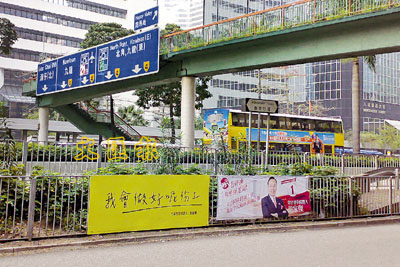 ■曾蔭權在競選活動中,一直非常重視與市民的互動。圖為曾蔭權與梁家傑的宣傳街板。曾蔭權競選辦公室提供