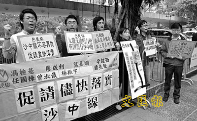 【本報訊】民協成員昨到立法會向議員遞交請願信,要求當局及兩鐵盡快落實「沙中線」。民協代表批評沙中線雖有路線圖,卻一直沒有時間表;早前傳出的分段動工的消息,他們認為不可接受,呼籲政府公開交待政府、兩鐵的商討進度,並信守承諾,達成最遲於2011年落成整條「沙中線」。本報記者高仲明 攝