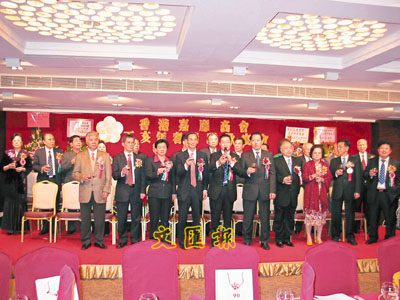 ■香港嘉應商會丁亥年春節聯歡宴會上,該會高層與主禮嘉賓上台祝酒,前排左起楊釗、劉宇新、陳衛平、黎桂康、曾智明、明俊富、廖長城、黃麗群、王永樂、鄒錫昌。 本報記者潘曉平 攝