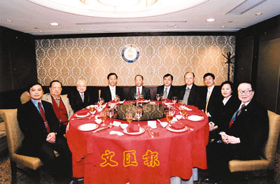 ■蘇浙滬同鄉會永遠名譽會長周忠繼(右四)、名譽會長徐國烔(左二)、名譽會長曹文錦(左三)、常務副會長周伯英(右一)及名譽會長曹光彪(中)合照。