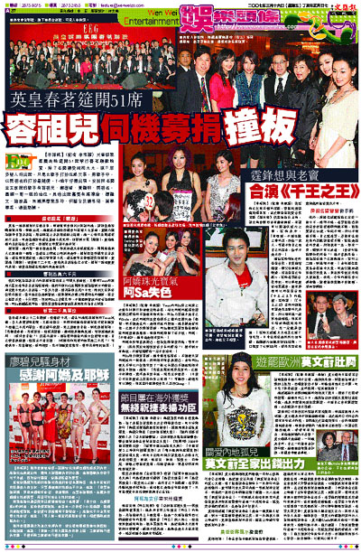 滿腔熱誠為籌款出力的容祖兒在晚宴上呼籲大家捐錢,又聯同Twins和經理人霍汶希拿著善款箱滿場飛,他們行到H2O老闆娘身邊強搶對方的銀包,掏出幾千元放入善款箱,一番努力後,總共籌到五萬六千元。席間又安排多位歌手演出,當中最出位是關智斌,濃妝艷抹及戴上很長羽毛的頭飾,在台上搔首弄姿,十分搞笑,期間阿Sa上台獻花時,不慎遭關智斌的背脊撞到胸部,阿Sa面露尷尬神色,索性從後攬住關智斌作狀跳舞來為自己解窘。