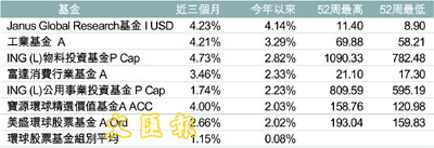 佔近今年以來榜首的Janus Global Research基金,基金成立於去年4月24日,基金平均市盈率為18.31倍。資產地區分佈為54.46% 北美、12.22% 已發展歐洲、9.3%英國、6.15% 日本、8.16% 已發展亞洲、4.82% 拉丁美洲、2.92% 新興亞洲、1.1% 澳大利亞及0.87% 新興歐洲。