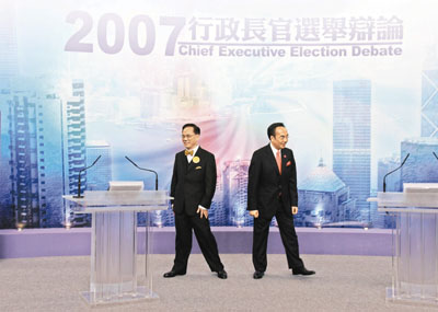 【本報訊】兩位特首候選人昨晚再度同場對壘,接受逾200名公眾人士及8大電子傳媒代表的質詢。由晚上8點開始,歷時90分鐘的論壇,兩人隔空較量,火花四濺。梁家傑在政制發展、公平競爭、扶助弱勢社群等不同的議題上,用各種方式將香港描繪成一個「被有錢人挾持的社會」、一個問題叢生的社會﹔而角逐連任的曾蔭權坦言﹕無論有錢無錢、有權無權、有票無票、有勢無勢,都是他的老闆,不能令香港陷入階級鬥爭,不能把香港分為有錢人與無錢人,千萬不能妄言分化,和諧的社會才是港人的共同發展目標。有學者認為,這場辯論的核心,超越一般的施政政策之爭,顯示出誰是對香港真正負責任的領導人,誰是將個人私利凌駕於社會福祉之上的「做秀者」。