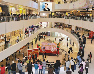 ■觀塘apm商場的大屏幕直播特首選舉辯論,吸引大批市民觀看。本報記者高仲明 攝