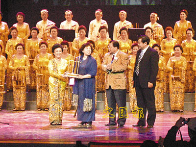 ■「印尼之夜」演出團向山東省僑聯主席饒曼妮(前排左二)贈送「安格隆」。