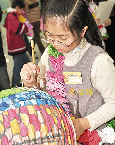 由桃園機場舉辦的兒童燈籠藝術節,14日舉行成果展示,一位得獎的小朋友現場示範在燈籠上作畫。中央社