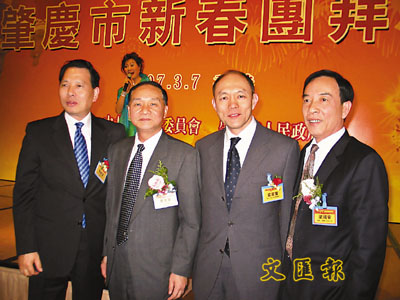 ■肇慶市委書記覃衛東(左二)與明俊富副特派員、霍震寰會長(右二)及市政協主席梁國安(右一)於新春團拜晚宴上合影。