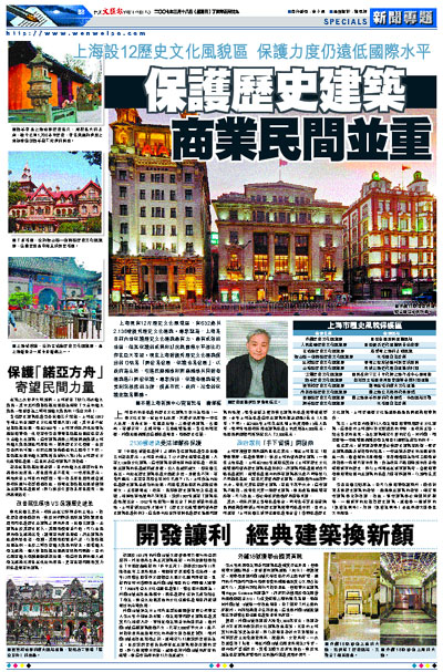 有「中國古城鎮保護神」之稱的著名建築保護學者阮儀三向記者表示,上海目前確立了12片歷史風貌保護區,共有2,138幢文化建築,這些建築受到法律的嚴格保護。政府對老建築的保護越來越重視,投入也越來越大。但阮儀三指出,內地在歷史建築保護方面起步晚,重視也不夠。有資料顯示,北京百萬四合院如今只剩下1%,上海作為內地保護歷史建築最成功的地區,和國際其他國家的差距還是很大,主要體現在:政府、民眾對歷史建築缺乏保護意識;相關法律法規尚不夠完善:歐洲1907年就有了建築保護法規出台,1962年法國第一個出台了關於城鎮的保護法,上海直到2003年才頒布了《歷史文化風貌區和優秀歷史建築保護條例》,這也是內地首部有關保護歷史街區和建築的法規;而資金匱乏使得對古建築的保護開發處處掣肘,去年上海為保護這些老建築的撥款超過2億元(人民幣,下同),在2005年上海花在此項上的費用是1.5億人民幣,而同年法國政府用在建築保護上的費用為4,000億元,法國民間組織和群眾還投入了2,000億元。