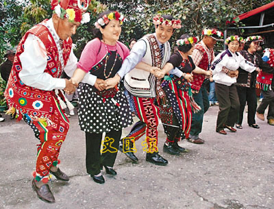 ■前國民黨主席馬英九(左三)17日前往台東卑南鄉悼念卑南族大頭目馬智禮,並且與卑南族長老共舞同樂。中央社