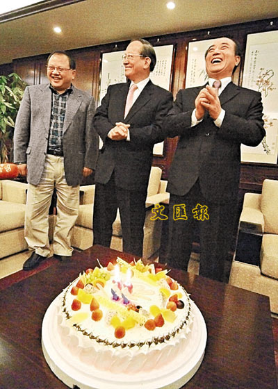 ■王金平 (右)17日在機場貴賓室接受「立法院」同仁致贈的66歲生日蛋糕,他許願時預祝大家都能心想事成。中央社