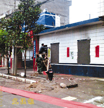 ■武警與民工在修補派出所的院牆。