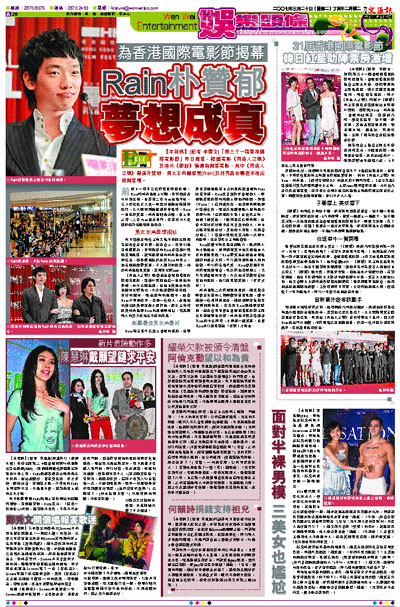 Rain坦言從小已愛上香港的電影,且發夢也沒想過能有自己的電影讓香港的Fans欣賞得到,Rain也喜愛許多香港藝人,很想能於電影節的活動上跟他們碰面,講聲「Hello!」這部處男作,他也很高興能跟朴導演合作,而首次拍戲便能入圍角逐今晚舉行的「亞洲電影大獎」最佳男主角,他想了想笑說:「能夠提名已很高興,且當中有好多好對手及我喜愛的藝人,如自己能得獎就最好,其他藝人得獎,我都會好開心!」導演朴贊郁也表示是一次很大的競爭,也希望男女主角能獲獎。