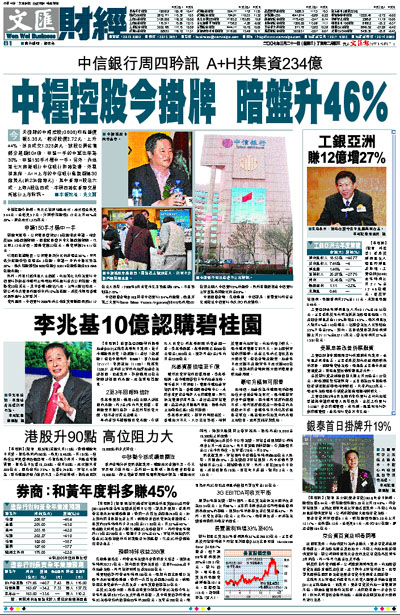 另外,外電引述消息人士透露,內地第七大商業銀行中信銀行計劃在本港和上海兩地同時進行首次公開招股,擬籌資30億美元,其中香港H股佔六成,上海A股佔四成,該公司本次發售的股份中約10%為舊股,將於本周四香港交易所進行上市聆訊。