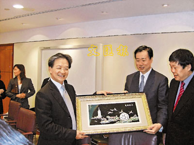 ■大連市市長夏德仁(右二)及網通集團黨組書記張春江(右一),向電盈副主席蘇澤光(左)致送紀念品。本報記者毛絮薇 攝