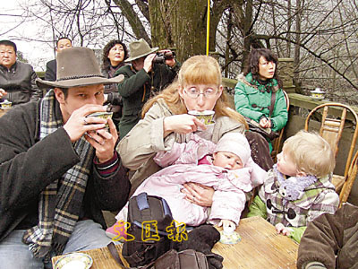 面對這無邊的春色,外國朋友都顯得那樣陶醉。韓國駐成都的總領事,也是背個大行囊,似一個矯健的「驢友」。有一對外國教師更是把自己的三個小寶貝帶在身邊,他們從幾個月到七八歲不等。一家人忽閃著碧藍湖水般的眼睛,觀察著這異國的春天,手捧飛龍圖案的蓋碗茶,享受著中國古代皇帝才能享用的飲料——蒙山甘露茶。