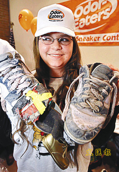 美國第32屆全國臭鞋大賽日前舉行,猶他州13歲女孩凱瑟琳,憑著一雙穿了1年半、臭氣沖天的Nike運動鞋,前日在「臭鞋」比賽中擊敗6位對手,贏得2,500美元(約2萬港元)獎金。 美聯社