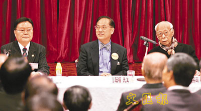 ■饒宗頤(右)昨日出席潮州商會與曾蔭權進行的閉門會面。