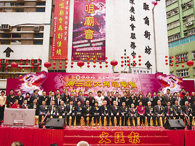 ■第三屆大角咀廟會日前開幕,節目豐富精彩。圖為開幕儀式上賓主合影。本報記者潘曉平 攝