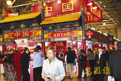■19日至21日,「2007年莫斯科國際旅遊交易會」在莫斯科克洛庫斯展覽中心舉行,開幕式當天被定為「中國日」。中國20個省區市旅遊局、旅遊企業參加了此次旅遊交易會。此次活動也是俄羅斯「中國年」活動的重要組成部分。圖為展覽中心的中國館外景。中通社