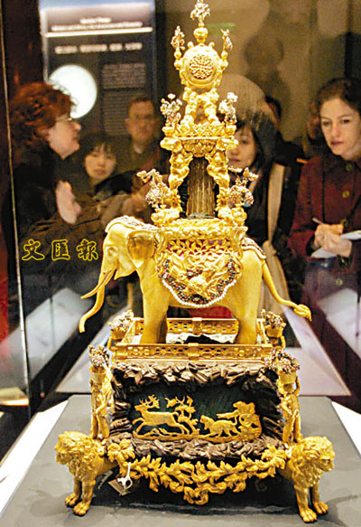 ■正在北京展出的銅鍍金象馱水法表。資料圖片