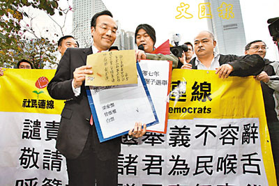 ■社民連成員向梁家傑遞交抗議信。本報記者梁祖彝 攝