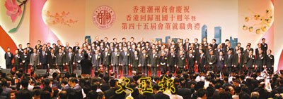 【本報訊】(記者 潘曉平)香港潮州商會慶祝香港回歸祖國10周年暨第45屆會董就職典禮日前假灣仔會議展覽中心新翼五樓大會堂隆重舉行。 中央政府駐港聯絡辦副主任周俊明,外交部駐港公署副特派員明俊富,特區政府財政司司長唐英年,民政事務局局長何志平,財經事務及庫務局局長馬時亨,全國僑聯副主席莊世平任大會主禮嘉賓。長實集團主席李嘉誠博士蒞臨致賀。