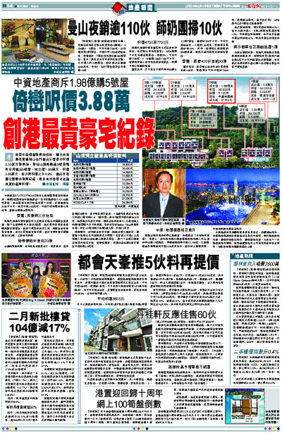 除倚巒外,近期豪宅成交不斷,紛紛出現大額成交,長實旗下渣甸山名門頂層複式日前獲一名買家以呎價3.33萬元購入第2座58至60樓三層複式單位,創下了全港分層豪宅物業的新高呎價。發展商揚言,同座58至60樓B複式單位呎價挑戰3.5萬元。