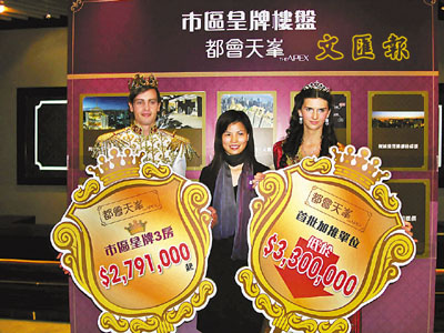 ■長實曹皎明(中)與扮King & Queen 的模特兒展示葵涌都會天峰的新優惠。 本報記者梁悅琴 攝
