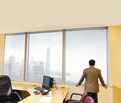 ■競選工程臨尾聲,曾蔭權昨日獨自一人憑窗遠眺美麗維港。照片由曾蔭權競選辦提供